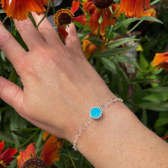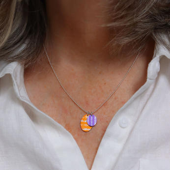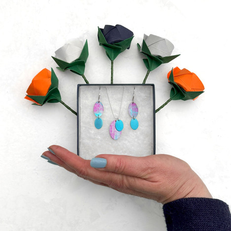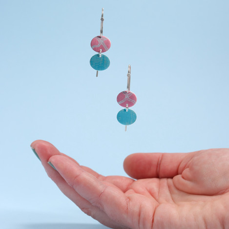 Silver jewellery created from colourful handprinted anodised aluminium and sea glass. Accessories with a modern twist.